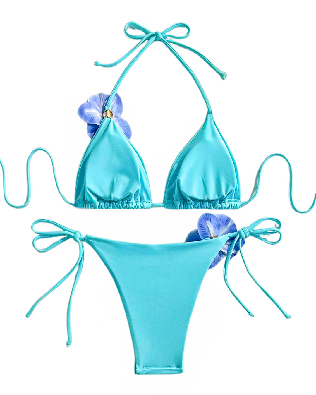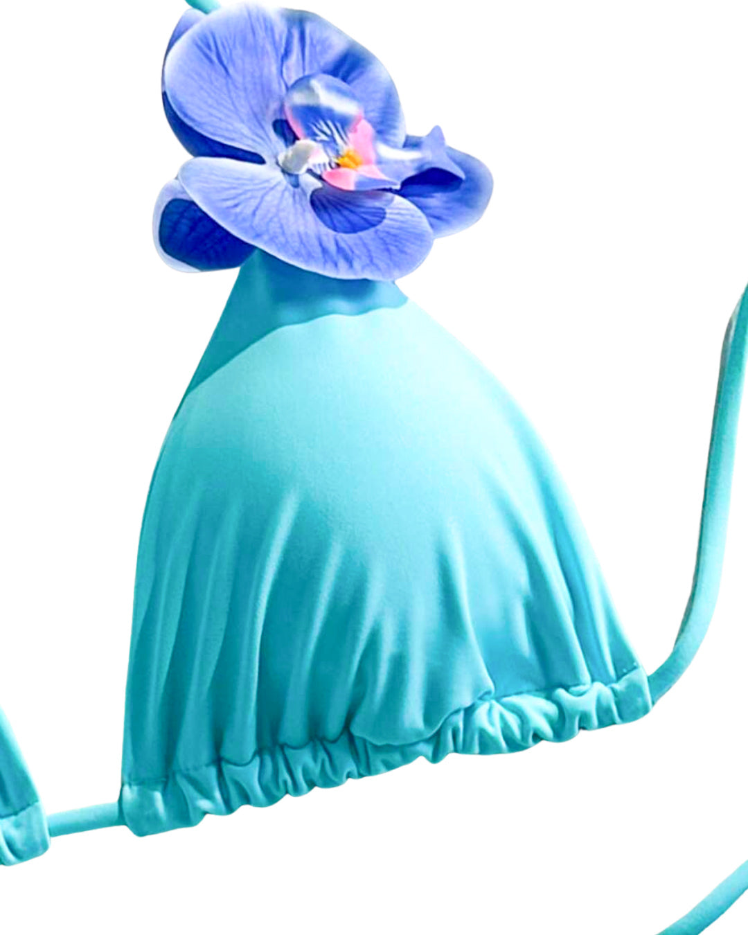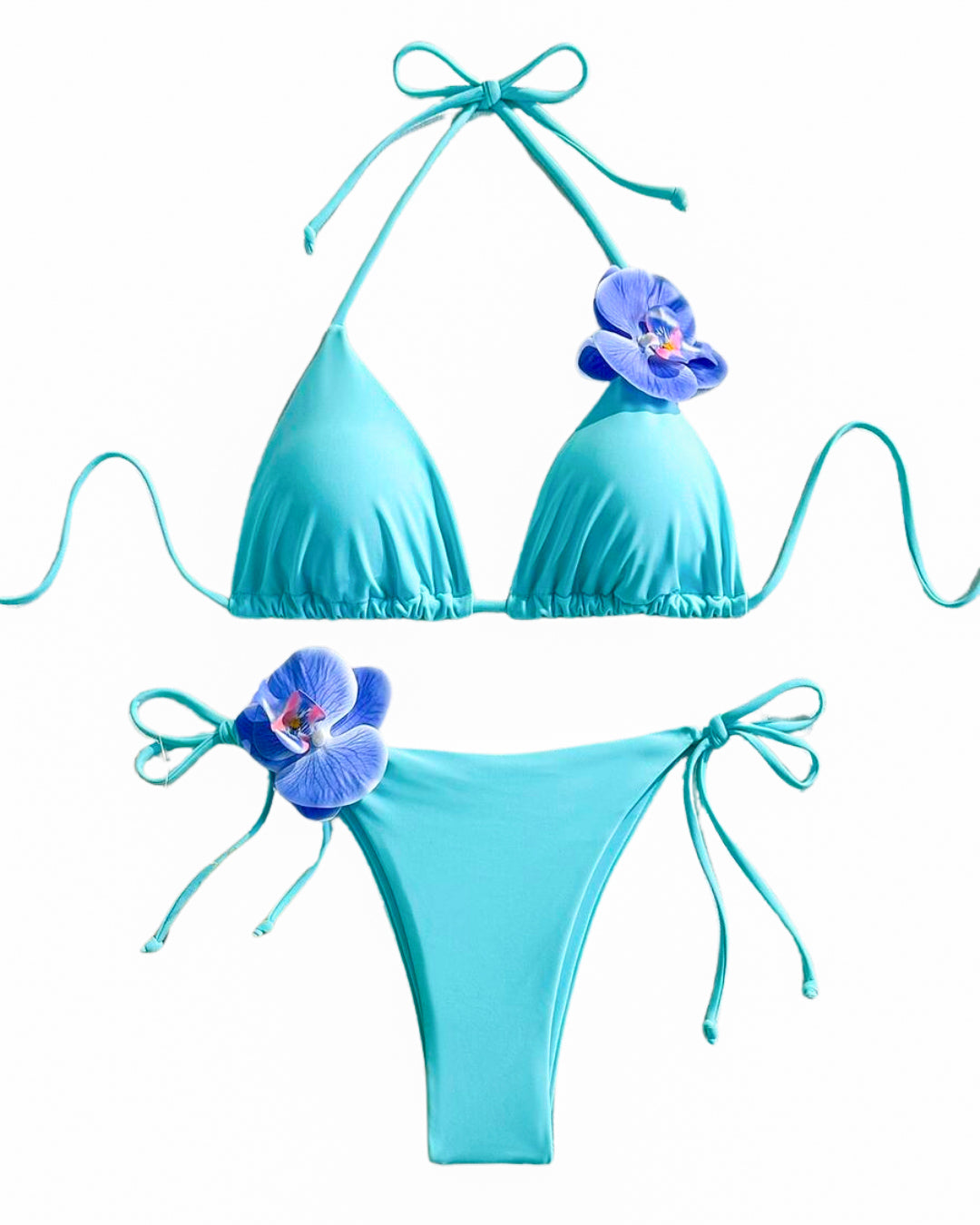 Florencia es ese bikini que transformará tu look de playa. Su tono celeste suave se mezcla con dos flores tipo orquídea que le dan un toque tropical y súper femenino. El top es de triángulo ajustable, cómodo y favorecedor, y el bottom tiene tiras a los lados para que lo adaptes a tu medida.