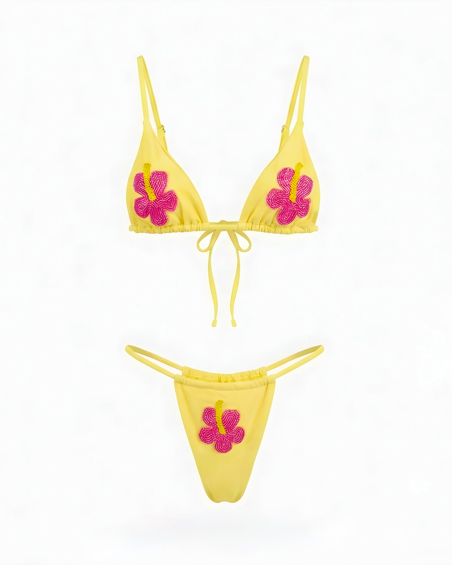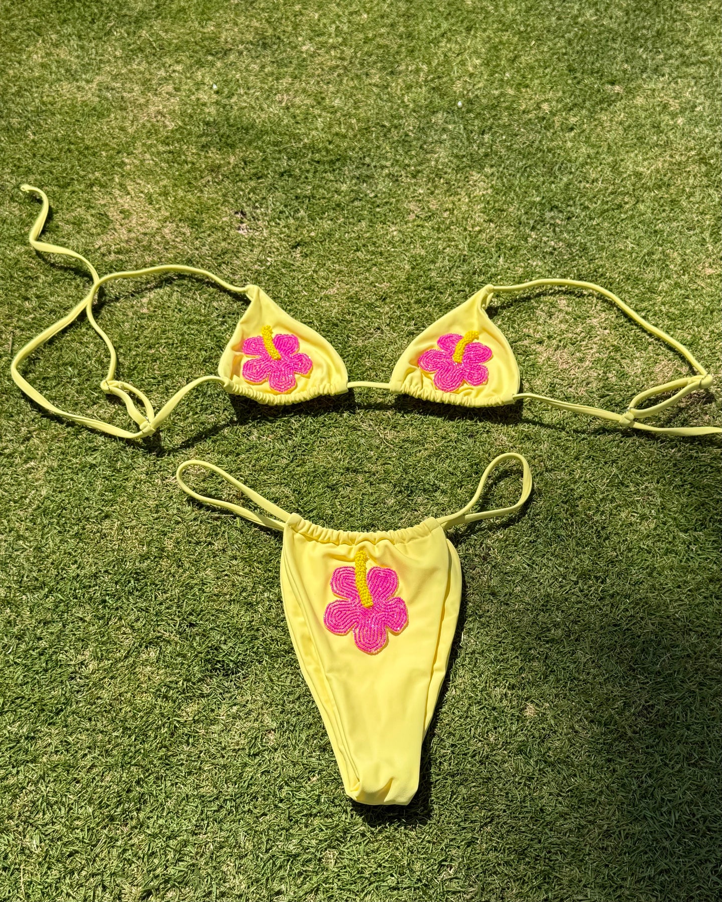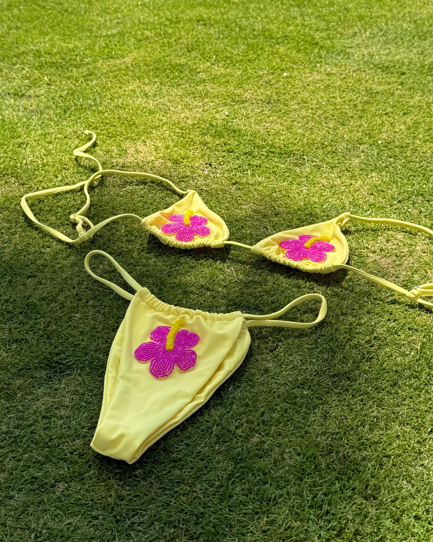 Un clásico veraniego con un toque único. Maui bikini ilumina tu piel con su tono amarillo suave y sus delicadas flores hechas con perlitas en forma de flor. 🌺 El top es estilo triángulo, ajustable y cómodo. La parte de abajo tiene un diseño r que estiliza la cadera y permite ajustar con la cobertura para que lo uses exactamente como te gusta.